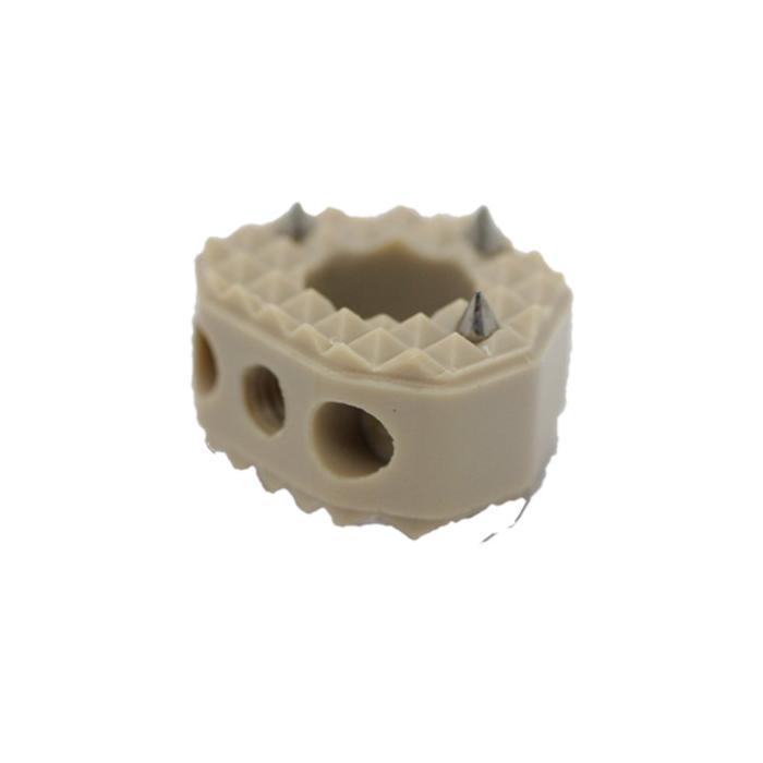 - Los dientes piramidales se anclan en las placas terminales del cuerpo vertebral adyacente, lo que proporciona resistencia a la migración del implante y reduce el riesgo de expulsión de la caja.