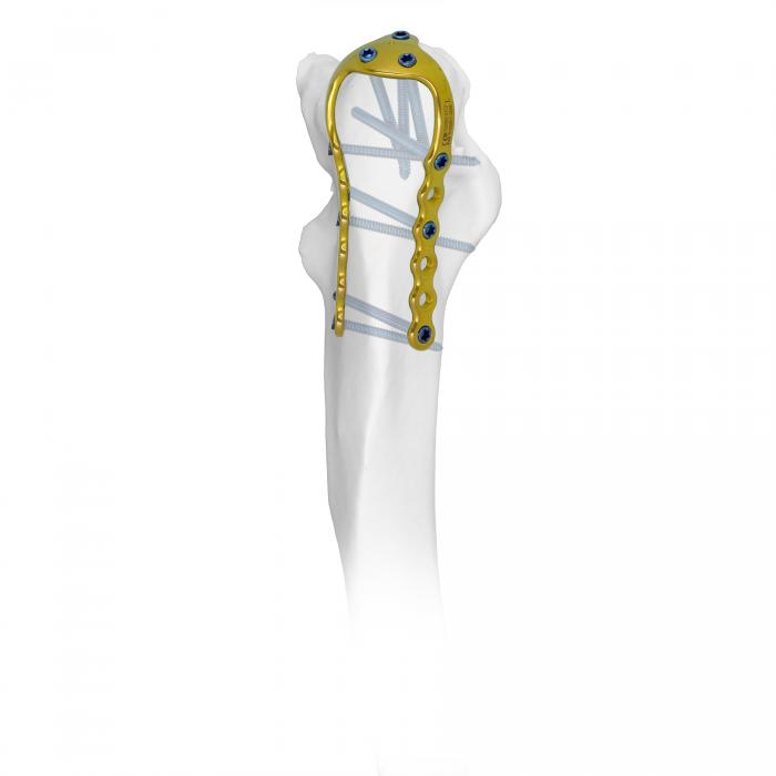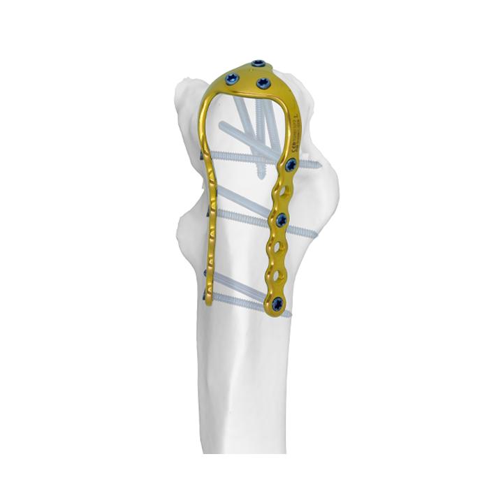 - Doble fila de tornillos distales para un contrafuerte biomecánico óptimo.