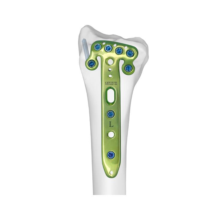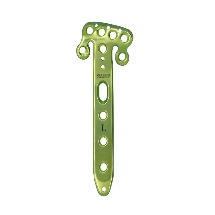 - Construcción de perfil bajo: borde distal biselado, superficie redondeada y pulida y tornillos avellanados para reducir la irritación de los tejidos blandos.