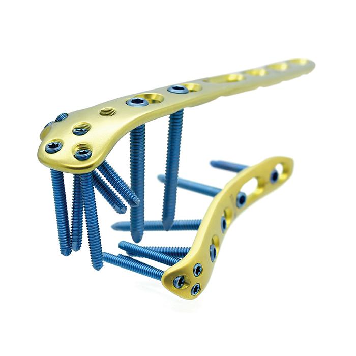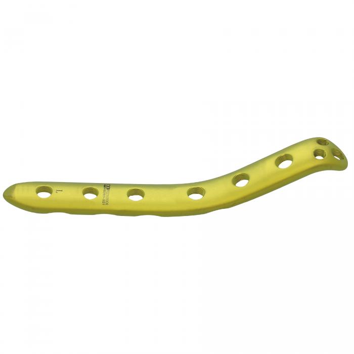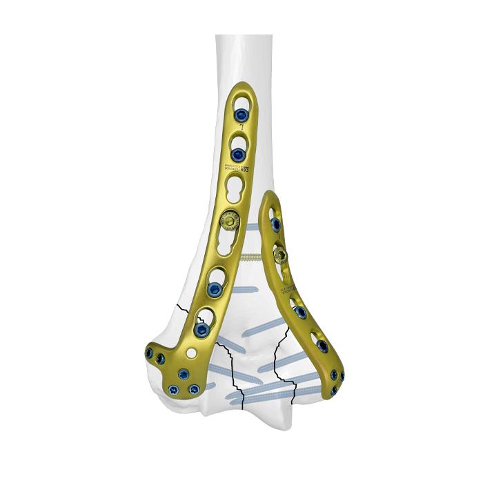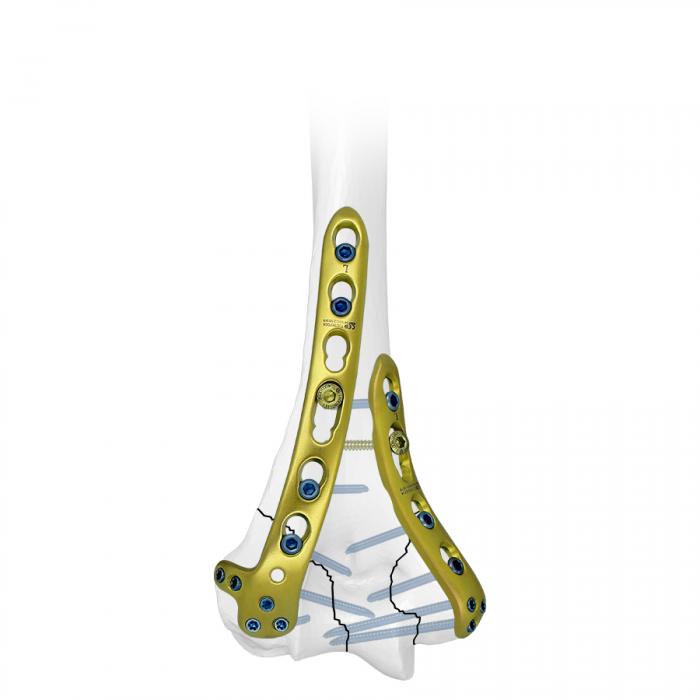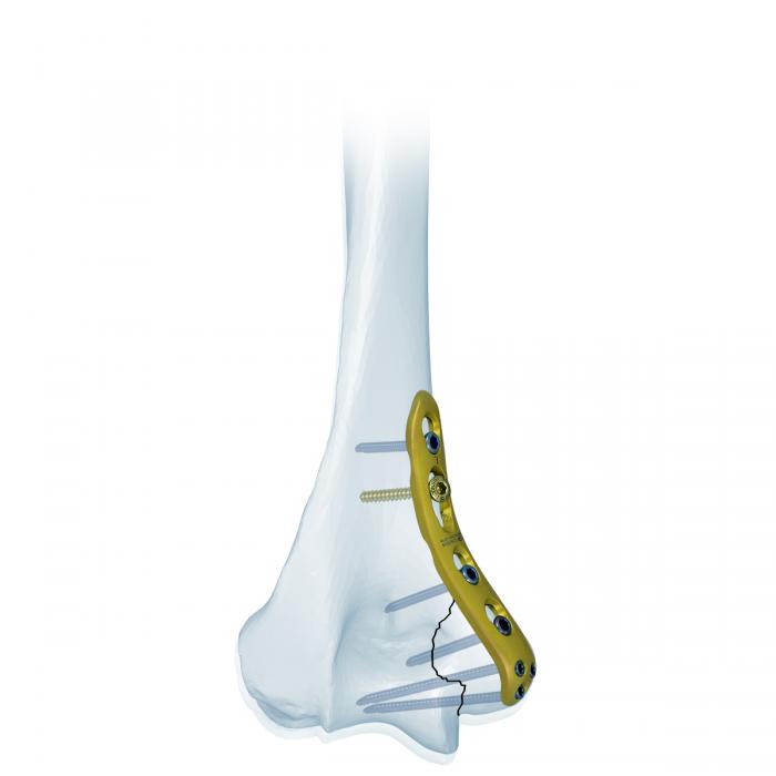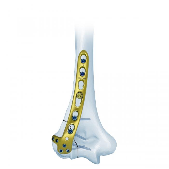 - Cinco tornillos angulares estables de 2.7mm para el bloque distal permiten la fijación de fracturas extremadamente distales, especialmente in hueso osteoporótico.
