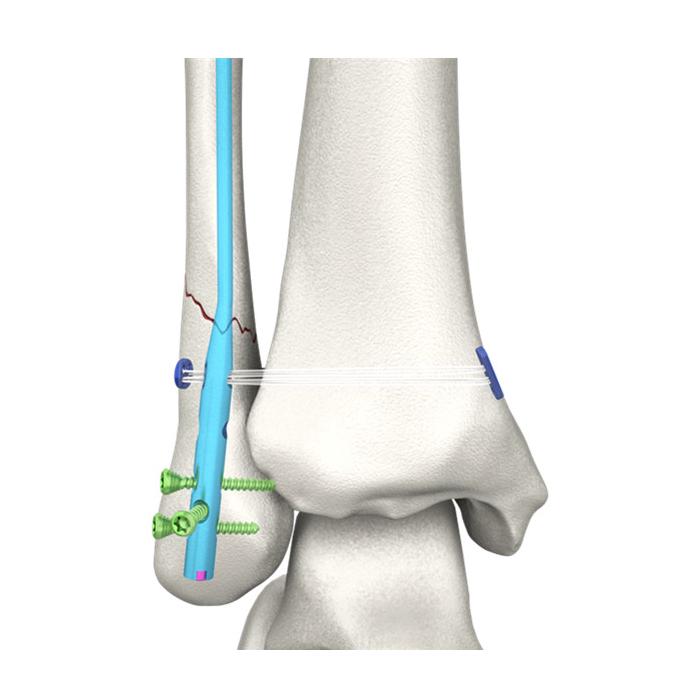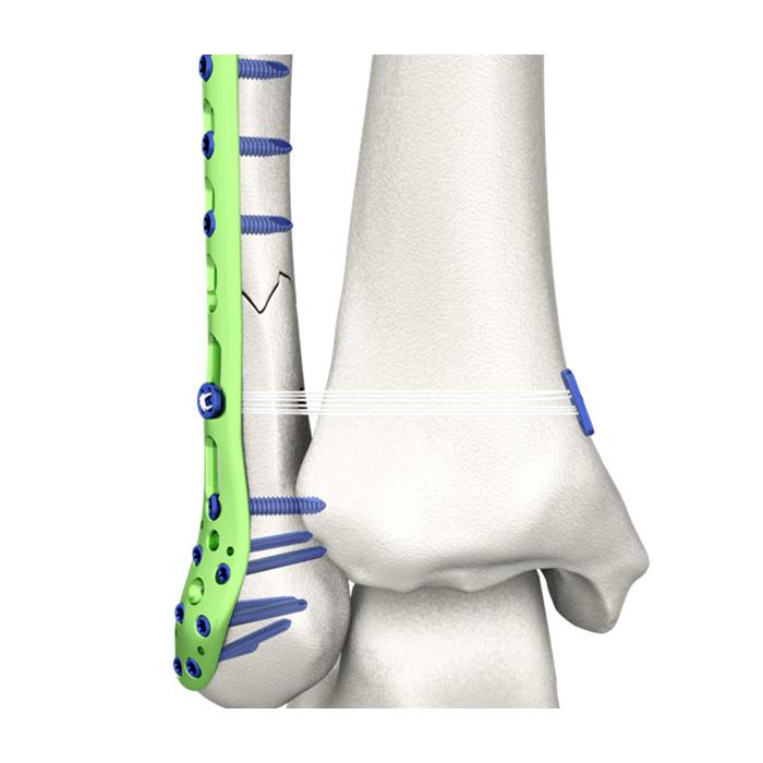 - La placa redonda de titanio de 6 mm está especialmente diseñada para fracturas combinadas de peroné distal. Se puede utilizar con la placa de bloqueo para peroné distal y los clavos intramedulares de Double Medical.