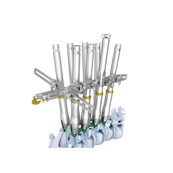 - La conexión rápida del instrumento de desrotación y la alineación en espiral se puede lograr en la etapa inicial. Este método de conexión permite un ligero movimiento del instrumento de desrotación en el plano sagital.